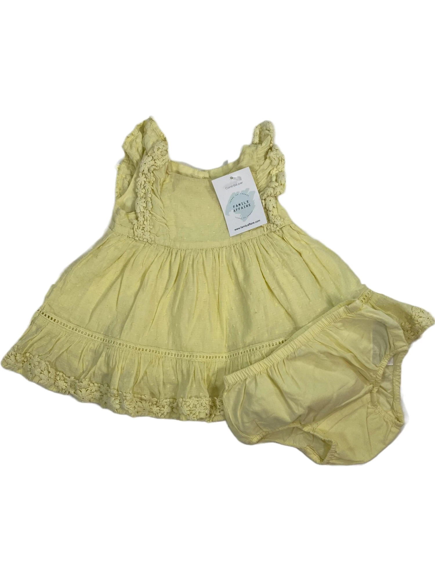 Cet ensemble jaune de la marque BabyGap est disponible en taille 3/6 mois. Il se compose d’une robe et d’un bloomer pour une tenue d’été parfaite et confortable pour les bébés. Faite d’un tissu doux et respirant, cette tenue offre confort et praticité à votre petit trésor.